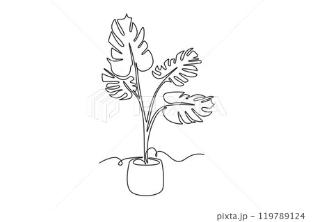 Continuous one line drawing beauty potted tropical leaf monstera plant. Printable decorative houseplant concept for home wall decoration ornament. Single line draw design vector graphic illustration
