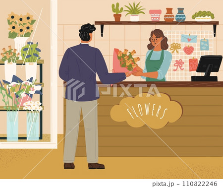 Flower shop scene with saleswoman and visitors