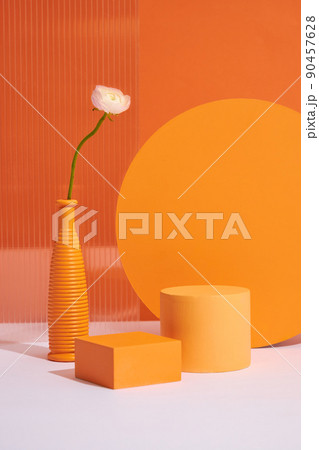 Front view of orange circle , square flower vase , pink tulips in orange background and with blank space for advertising
