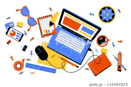 Office workplace. Work table top view. Business technology. Laptop and papers on desk. Computer screen and keyboard. Isometric creative mobile phone. Coffee cup or stationery. Vector tidy background