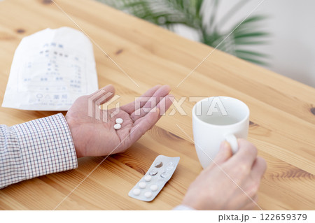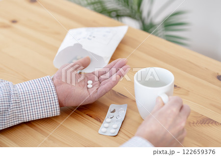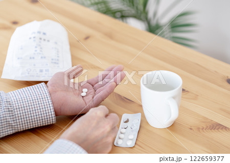 一個病人在客廳服用口服藥物、補充劑和藥物。