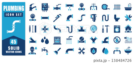 Plumbing Solid Icon Set Featuring Bold Vector Symbols Of Pipes, Water Systems, Tools, And Maintenance. Clean Modern Style Ideal For Web, Apps, Construction Projects, And Infographics.