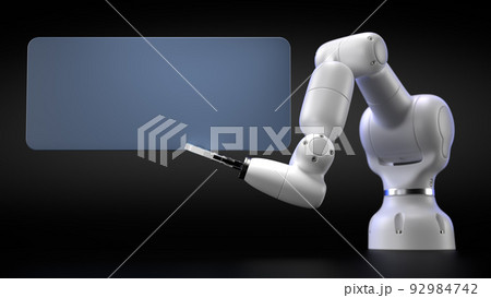 Robotics arm holding blank blue boards on black background.