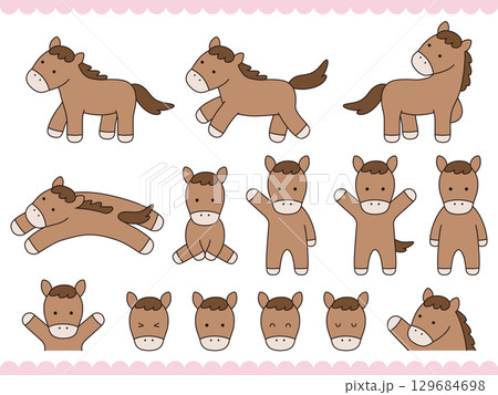 插圖集各種姿勢的馬(站立、行走、奔跑、跳躍、踢腿、吃草、坐著)