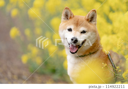 油菜花背景下的柴犬,田野裡玩耍的柴犬,可愛的柴犬,茜柴犬