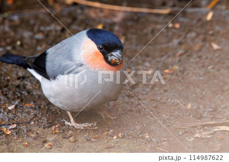 一隻可愛的紅腹灰雀(Atriidae)到溪邊喝水。 位於日本千葉縣市川市大町公園自然觀察園。 2
