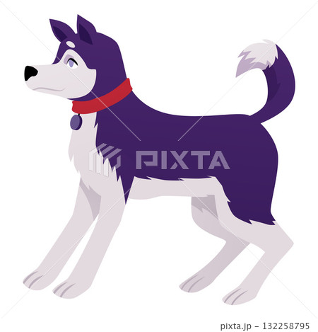 Cartoon husky dog with a red collar, side view, standing on its paws with its tail raised.