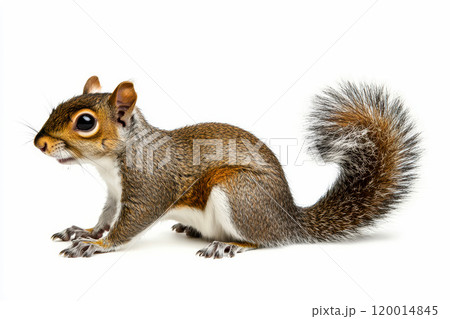 Eastern Gray Squirrel sitting in natural pose isolated on white background, photo realistic.