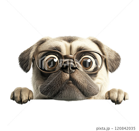 A cute pug wearing round glasses peeks over a white surface with a curious expression.