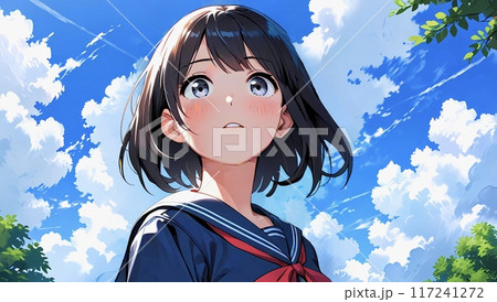動漫風格的插圖,描繪了晴朗的冬日里,高中生或國中生仰望天空的情景,左側留有空白