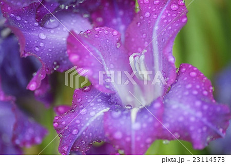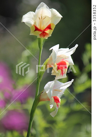 清晨的陽光下盛開的白色唐菖蒲花~八月的早晨~