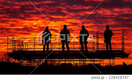Silhouetted workers stand on scaffolding against a dramatic sunset backdrop.
