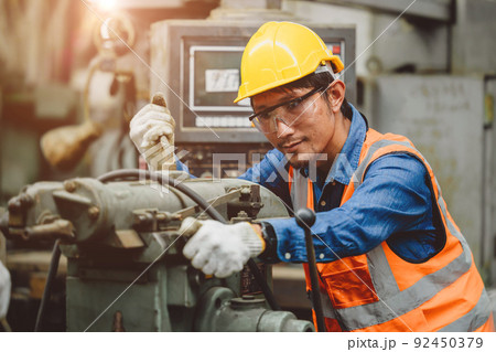 Steel factory staff worker Asian man work in a heavy industrial machine with safety engineer uniform.
