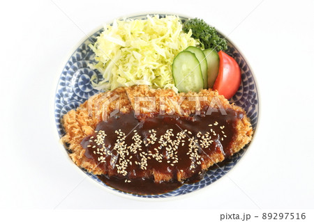 Crispy Pork Cutlet with Brown Sauce and Rice on White Plate