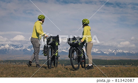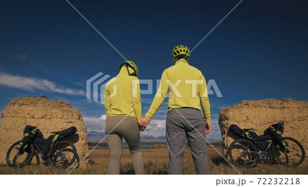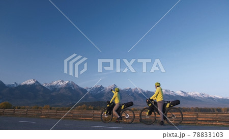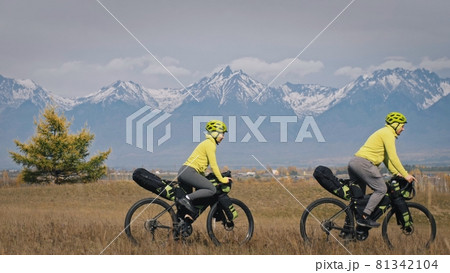 The man and woman travel on mixed terrain cycle touring with bikepacking. The couple journey with bicycle bags. Mountain snow capped.