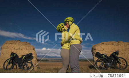 The man and woman travel on mixed terrain cycle touring with bikepacking. The two people journey with bicycle bags. Mountain snow capped, stone arch.