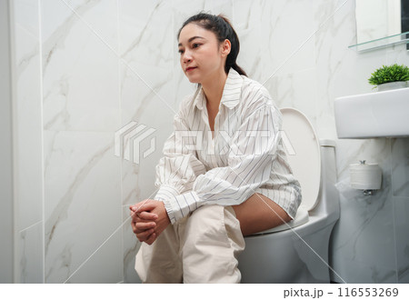 stress woman have problems while sitting on a toilet bowl in bathroom