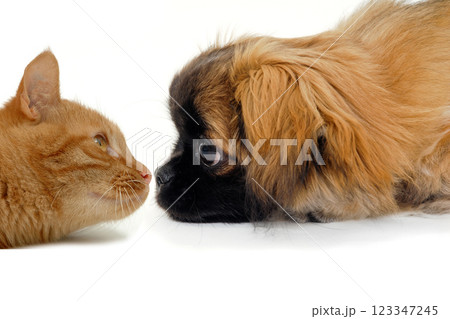 Pekingese dog sitting isolated on a white background. Happy Pekingese puppy standing on white background.