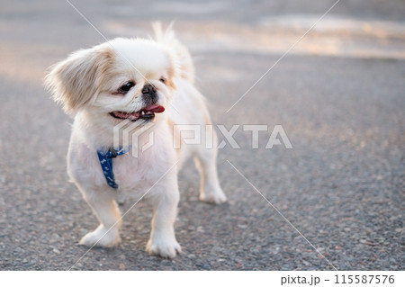 Small breed dog, Pekingese. Portrait of a pet. Sad