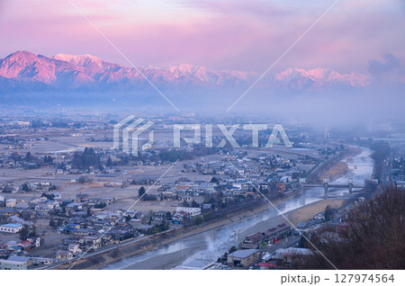 [冬季素材]冬季的松本平和雲霧繚繞的北阿爾卑斯山[長野縣]