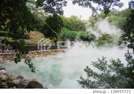 台灣北投溫泉地熱谷中升騰起的蒸氣景象。