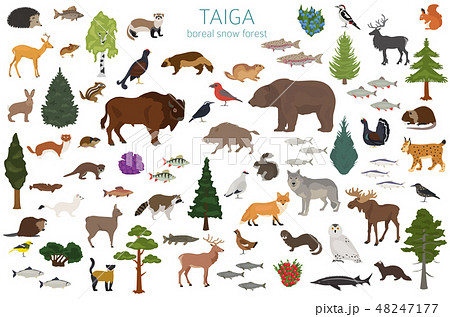 Taiga animals, set of cartoon style vector illustration isolated on white