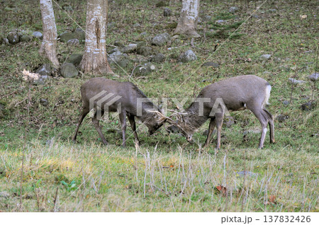 知床山脈的雄性和雌性和梅花鹿(北海道知床)