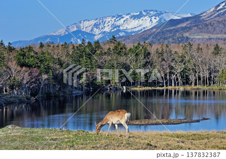 春天的知床山脈和雌性梅花鹿(北海道知床)