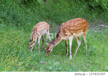 一隻母鹿帶著小鹿在吃草(北海道層雲峽)