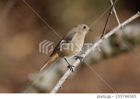 一隻雌性達烏裡紅尾鴝棲息在枯葉上,回頭望向前方。