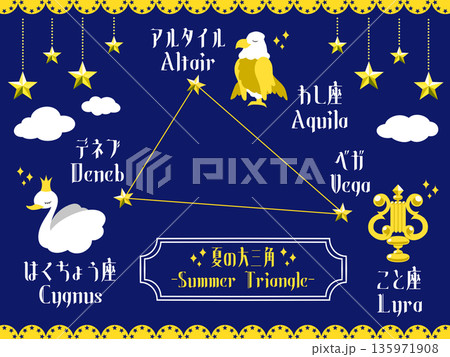 夏季大三角由一條黃線連接(星座僅由恆星組成,沒有連接線)