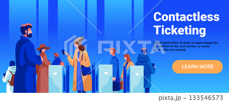 Ticket gate entry people using machines queue modern subway station blue background website banner