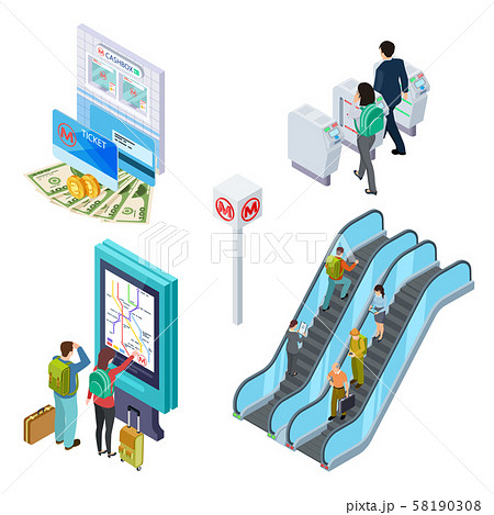 Isometric metro elements. Subway escalator, turnstile, info desk with people. 3d underground