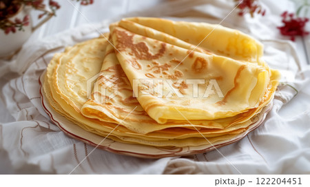 Stack of freshly made crepes on a plate.