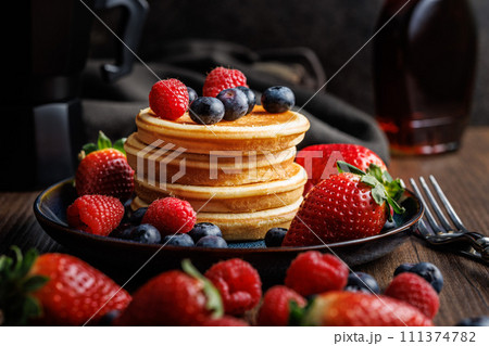 Homemade classic american pancakes with blueberries, raspberries and strawberries.
