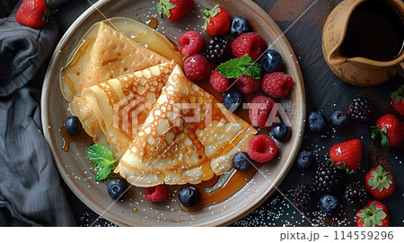 Beautifully folded crepes and topped with an assortment of summer berries. Generative AI.