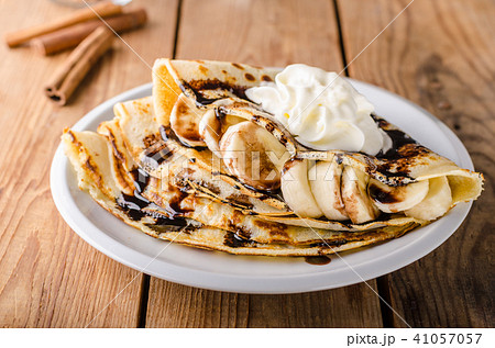 thin pancakes with banana and whipped cream