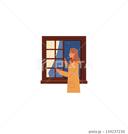 Pensive female figure contemplating celestial bodies from the comforting interior under night's