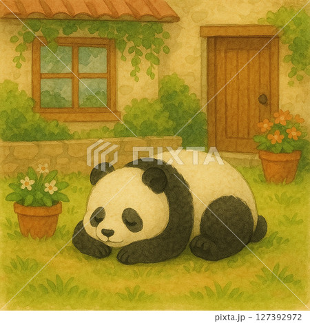 熟睡的熊貓在庭院裡|パンダの昼寝 × 可愛い插畫 × 水彩童趣風