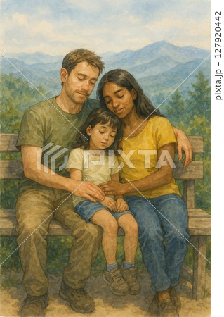 溫馨一家人在山間休憩,時光與光 | 跨國家庭親子水彩畫