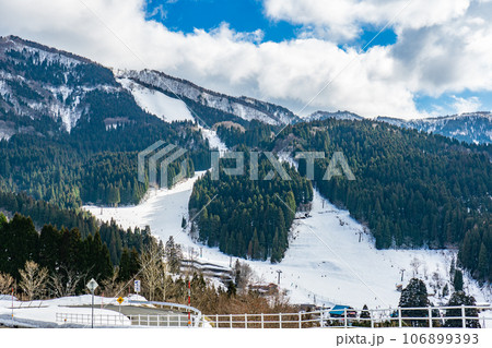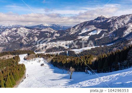 從冬季滑雪勝地中心可以看到白雪皚皚的山峰和從兩座山峰延伸出的陡峭山坡(群馬縣川場市)