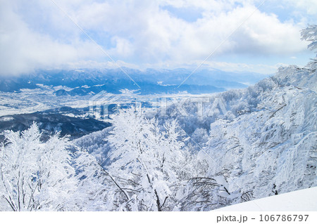 從滑雪纜車上欣賞白雪皚皚的山脈和北阿爾卑斯山的壯麗景色(長野縣、志賀高原、橫手山)
