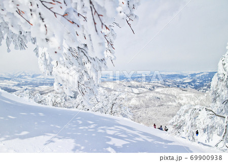 山形藏王滑雪者從臧格坡霧凇球場滑下