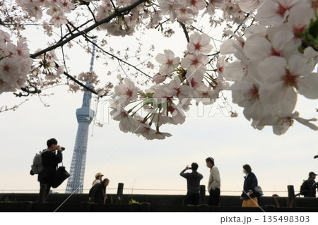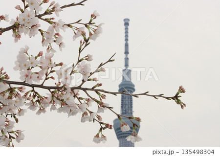 櫻花盛開,背景是東京晴空塔。櫻花才剛開始綻放。