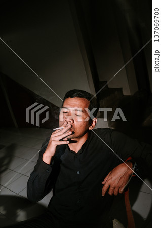 Man Smoking Cigarette in Dark Room with Dramatic Lighting