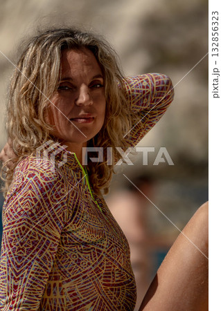 Woman posing blonde, relaxed woman in patterned top outdoors on a sunny day