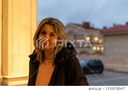 Woman portrait city street at dusk standing by a warmly lit architectural column, smiling casually in winter jacket