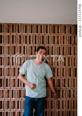 Adult Man Standing Confidently Against a Modern Terracotta Wall