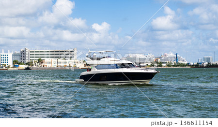 Yacht in navigation. Private luxury boat anchored off Miami beach. Summer boat vacation. Miami yachting. Yacht vacation in summer. Marina bay. A luxury motor yacht in sea marina bay. Luxury travel