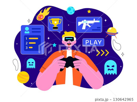 Virtual Reality Gaming Illustration featuring People Using VR Glasses and Controllers to Explore Metaverse Technology and Interactive Experiences